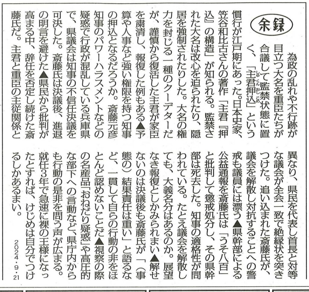 最近の有名事件に関連して、拙著『主君「押込」の構造』が二つの新聞で取り上げられました。